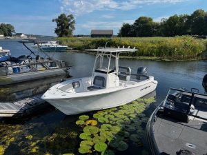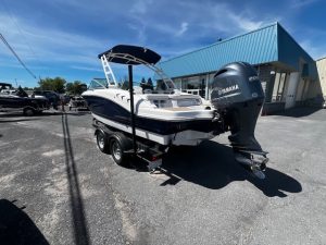 B862 2022 Chaparral 21 SSI Fish N Ski Powered with the Yamaha F200XB and only has 5.2 hours and includes the Coyote tandem axle bunk trailer Bimini top bow and cockpit cover