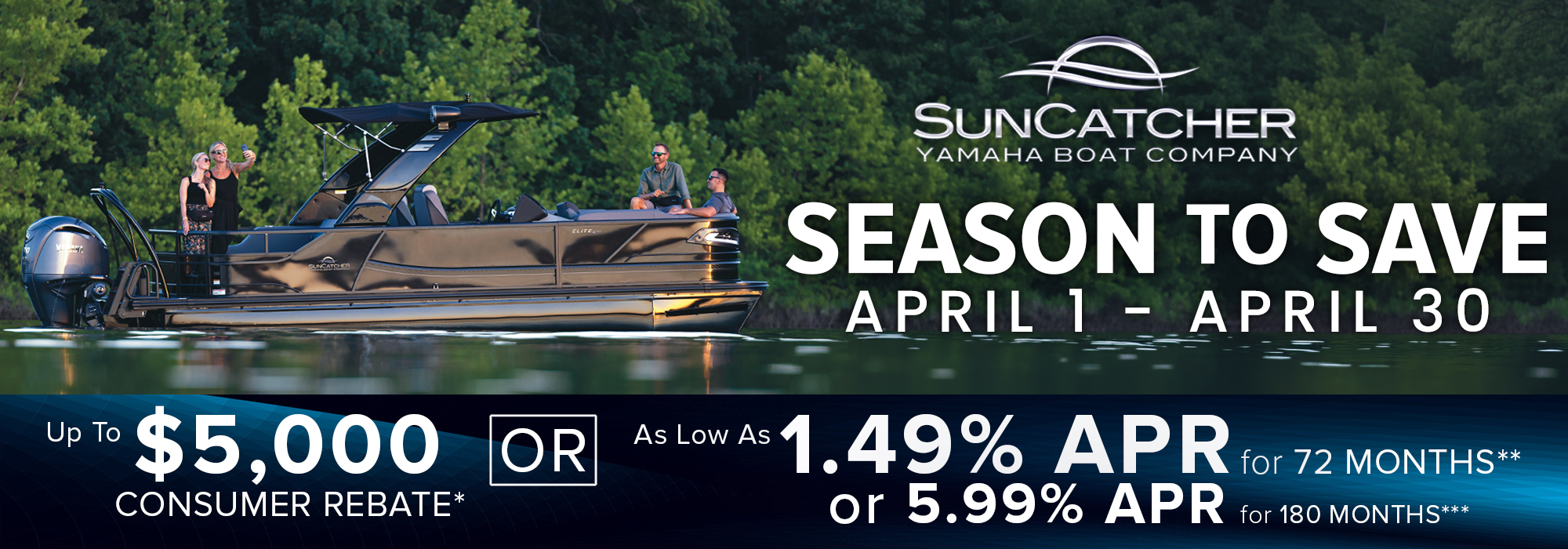 Customer benefit for purchasing a new (unused, not previously warranty registered) eligible SunCatcher pontoon boat Model Year (“MY”) 2020 to 2026 (“Boat”) from April 1, 2026 to April 30, 2026 is the choice of one (1) of the following: (i) an instant rebate of up to $5000 (exact amount dependent on model purchased) applied at time of final sale by dealer, at no extra cost to consumer who resides in the U.S.A.*; or (ii) 1.49% for 72 months to a customer who resides in the U.S.A. only **; or (iii) 5.99% for 180 months to a customer who resides in the U.S.A. only ***.